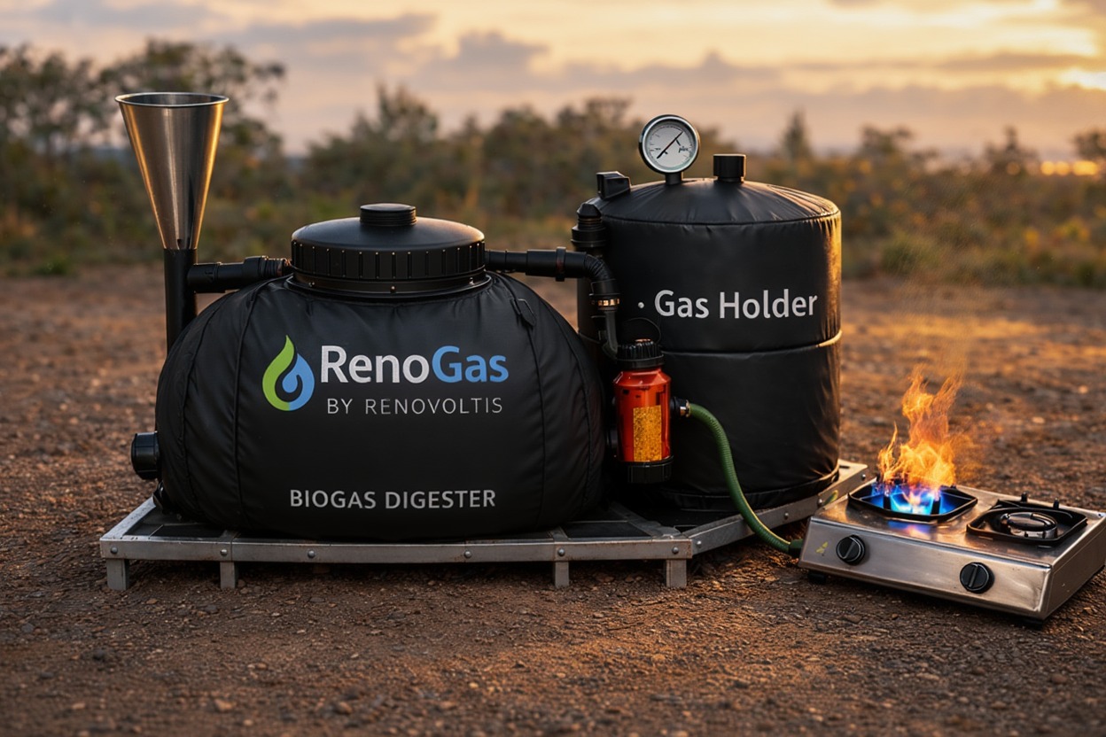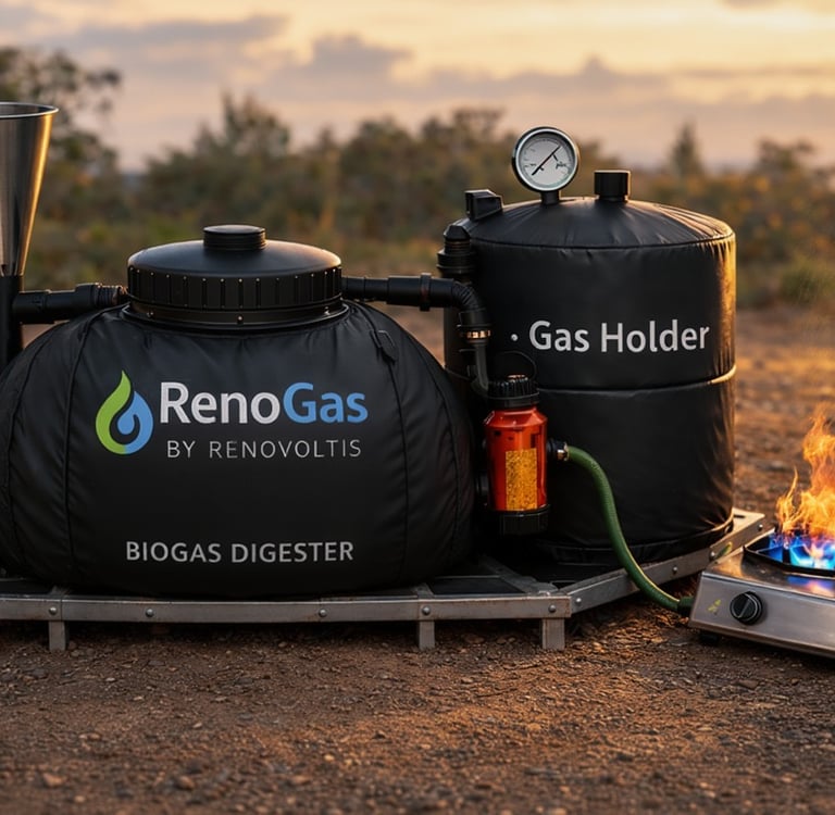 RenoGas is envisioned as the first practical product in the RenoVoltis ecosystem — a compact biogas solution built to convert organic waste into clean, usable gas for everyday energy needs.